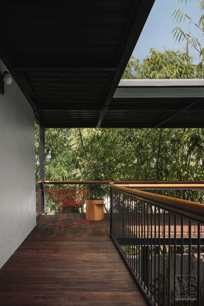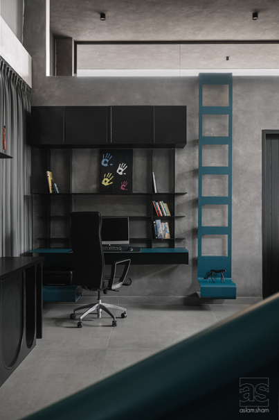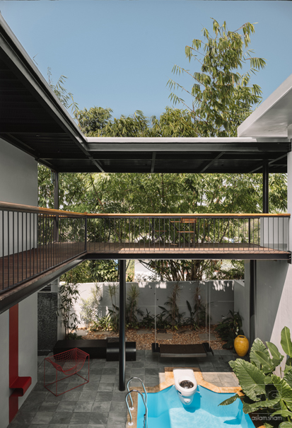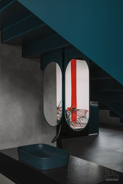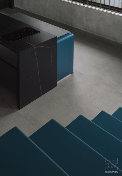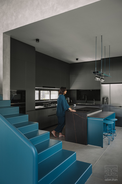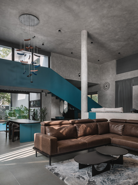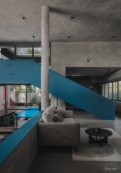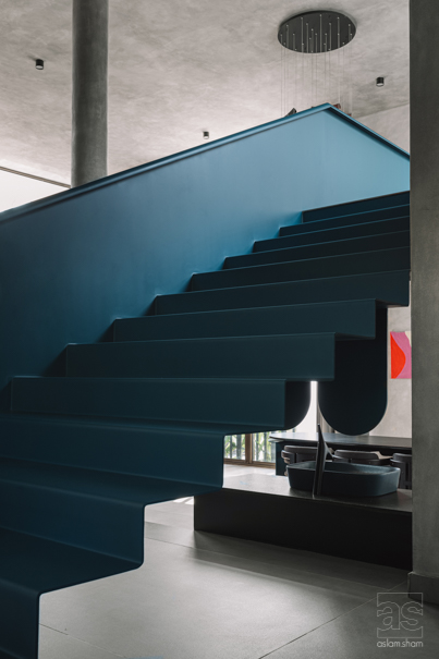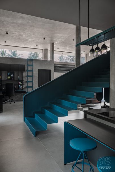 At its centre, a singular flourish: a swooping staircase in teal-blue steel. Floating mid-air, it’s less a staircase than a moment of flight—a sculptural thread stitching the house together.